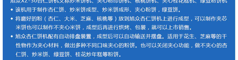 ◆杏仁餅機(jī)用于制作杏仁餅、炒米餅成型、炒米餅成形、夾心粉餅,綠豆餅。