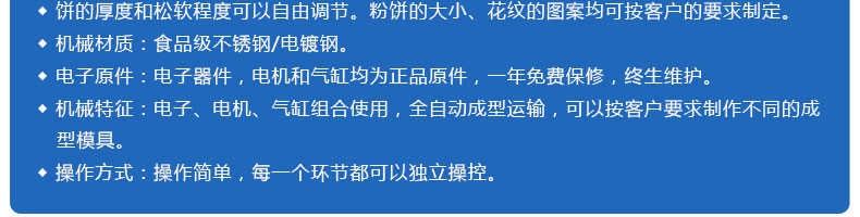◆餅的厚度和松軟程度可以自由調(diào)節(jié)。粉餅的大小、花紋的圖案均可按客戶的要求制定。