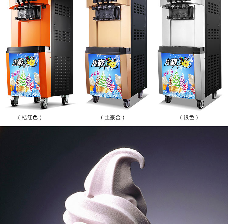 名稱BQL-928冰淇淋機 電源220V 功率2.3kw 產量20-30L/h 尺寸540×676×1360mm 重量118kg 規(guī)格 其他顏色:銀色,桔色,土豪金