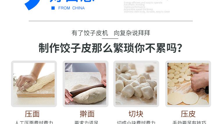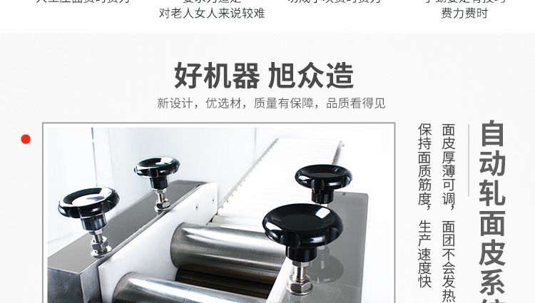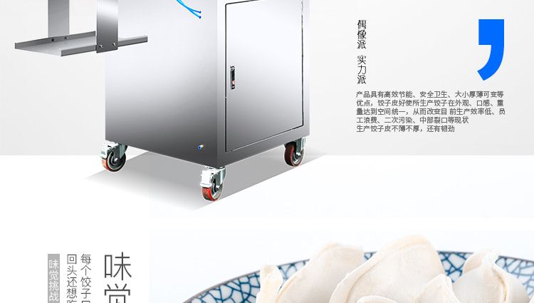 JGB-90型餃子皮機是我公司開發(fā)生產(chǎn)的先進餃子皮生產(chǎn)設(shè)備??梢院唵胃鼡Q模具(可根據(jù)客戶定制不同形狀、尺寸的模具),本設(shè)備采用氣缸運動。本廠生產(chǎn)的90餃子皮機,采用多道壓面輥壓面,壓面效果優(yōu)異,壓出的面皮筋道,進一步提高所包出的餃子口感。