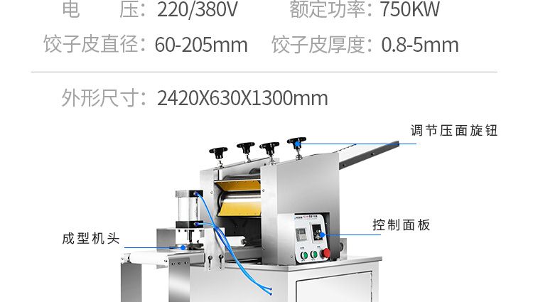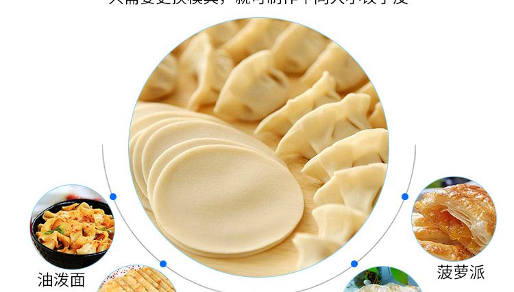 名稱JGB-90型餃子皮機 電源220/380V 功率400W 產(chǎn)量0-7000個/h 尺寸2420×630×1300mm 重量60kg 規(guī)格60-210mm直徑 其他
