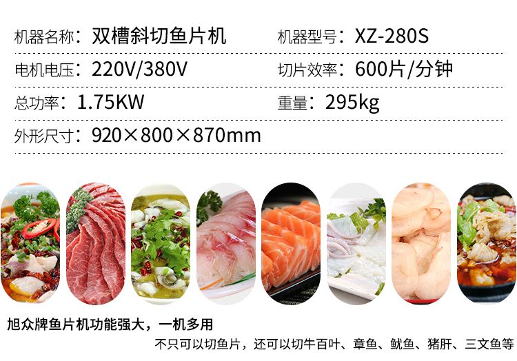 名稱XZ-280S全自動切魚片機 電源220V/380V 功率1.75KW 產(chǎn)量600片/min 尺寸920×800×870mm 重量295kg 規(guī)格 其他