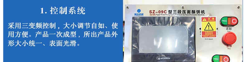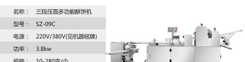 SZ-09C三段壓面酥餅機(jī),生產(chǎn)速度、制品大小、重量、皮餡比例可隨時(shí)調(diào)整、變更。適用于蘇式月餅、綠豆餅、老婆餅、蔥油餅、鮮花餅、肉松餅、金華酥餅等。適用于大、中型糕餅生產(chǎn)廠家,免費(fèi)提供工藝技術(shù)。