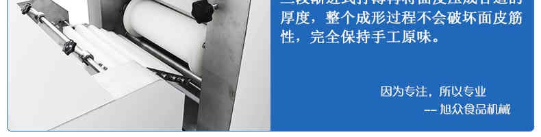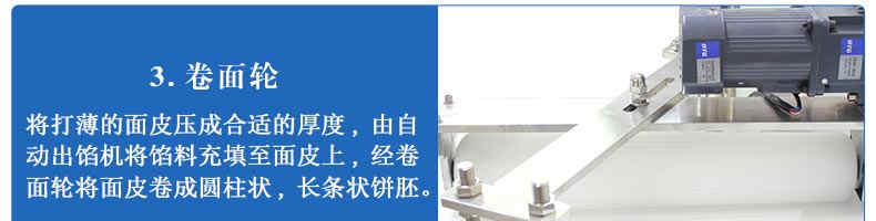 旭眾牌SZ-09C多功能三段酥餅機(jī)采用三段漸進(jìn)式打薄再將面皮壓成合適的厚度。由自動(dòng)出餡機(jī)將餡料充填至面皮上,經(jīng)卷面輪將面皮卷成圓柱狀,最后以成型刀具切割成球狀。長條狀餅胚,整個(gè)成形過程不會(huì)破壞面皮筋性,保持手工原味。