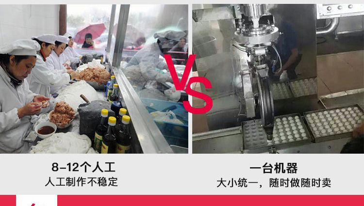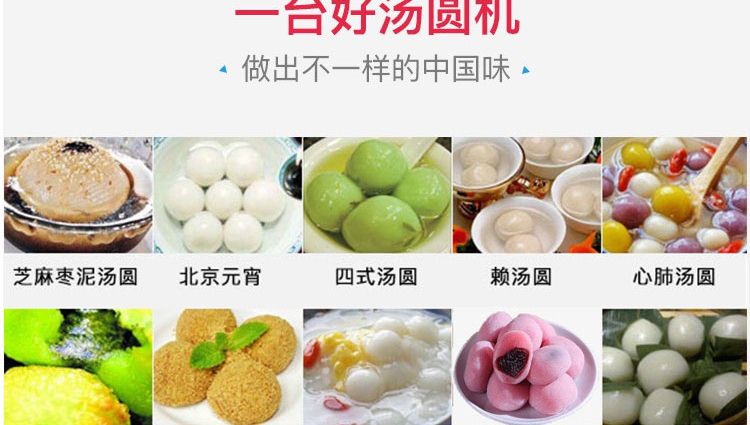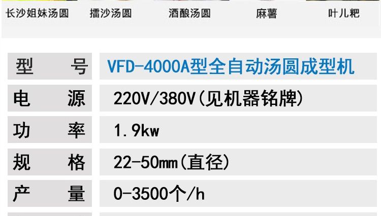 VFD-4000A型全自動湯圓成型機,功能齊全,適用性廣,自動化程度高,定量準確,操作簡單,只要將面團與餡料放入進料口,開機便可自動搓圓、成型,制品不易變形。