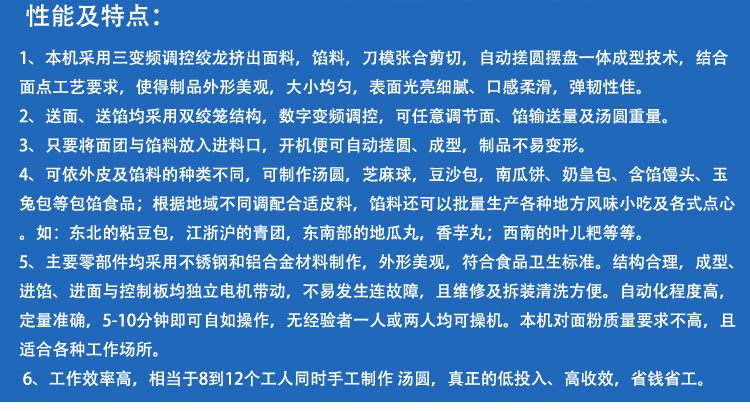 本機工作效率高,對面粉質(zhì)量要求不高,適合各種工作場所。本機提供免費上門培訓指導、安裝、調(diào)試、面點工藝傳授。