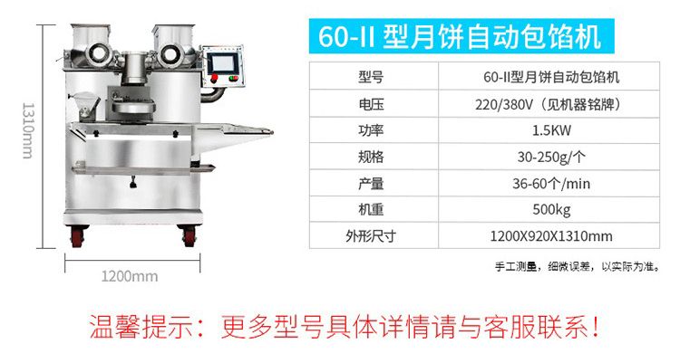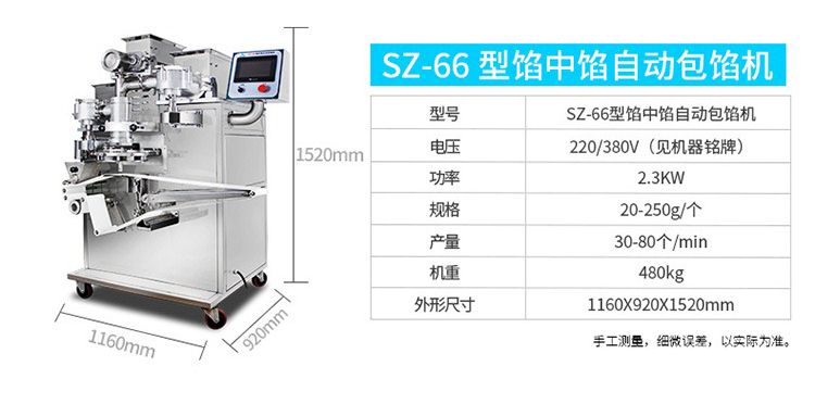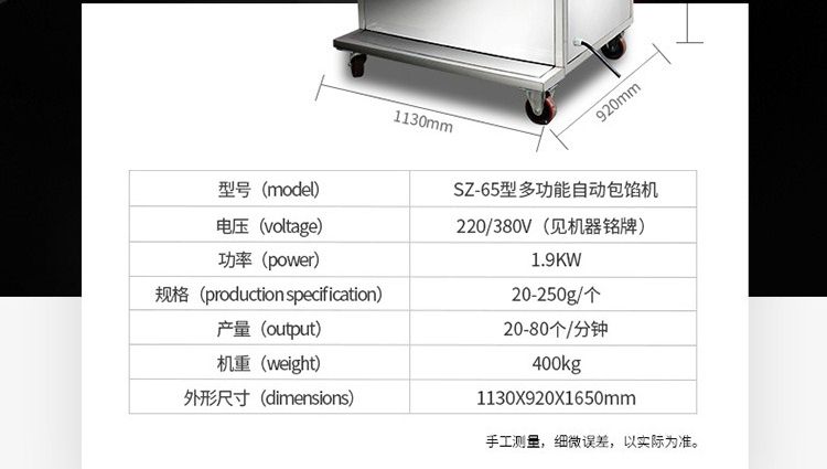 名稱SZ-65型多功能包餡機 電源220/380V 功率1.9kw 產量20-80個/分鐘 尺寸1130×920×1650mm 重量400kg 規(guī)格20-250克/個 其他皮餡比例2:8 5:5