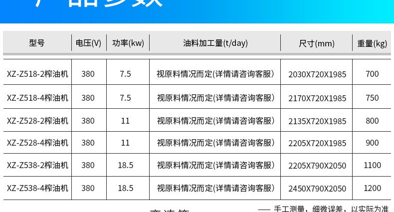 備注 | 每小時產(chǎn)量380斤物料(根據(jù)物料不一樣產(chǎn)量也不一樣),輔助設(shè)備配離心濾油機或正壓雙桶濾油機(需選配空壓機)、炒貨機配XZ-C180或XZ-CD200 |